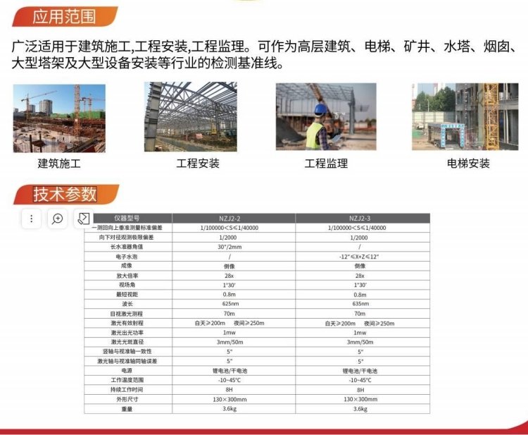 DZJ-300A可廣泛應用于建筑施工、工程安裝、工程監理、變形觀測。如:高層建筑、電梯、礦井、水塔、煙囪、大型設備安裝、飛機制造、造船等行業。 性能特點: ...